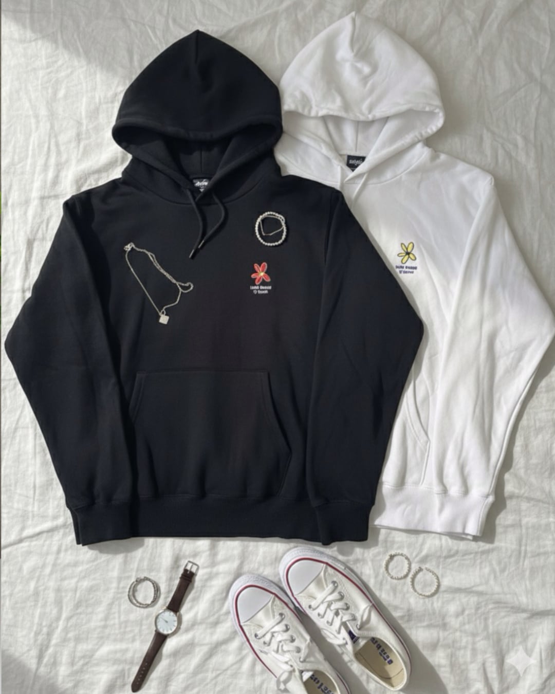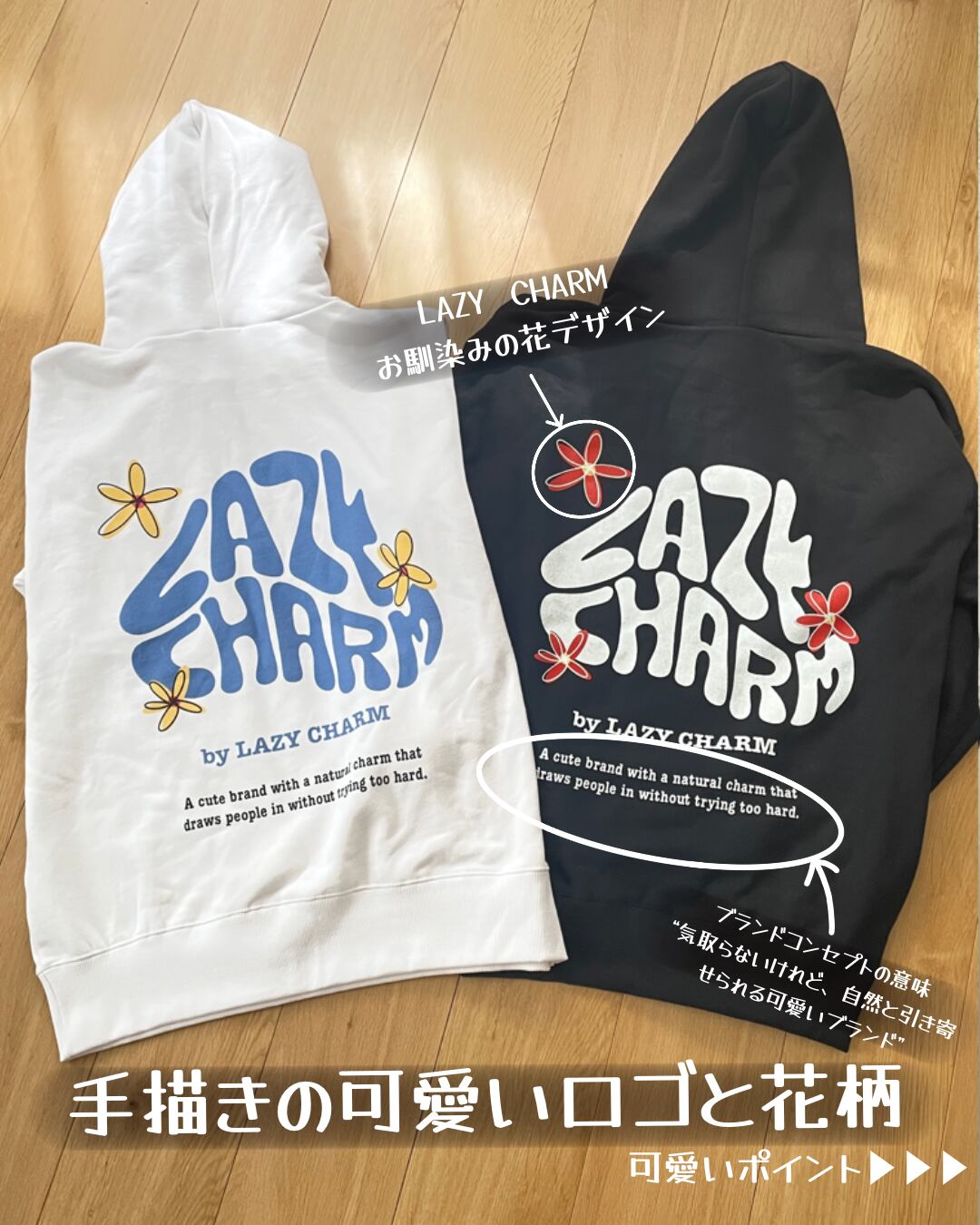 その個性を象徴する、ポップなロゴとフラワーグラフィックが目を引くフーディーです。